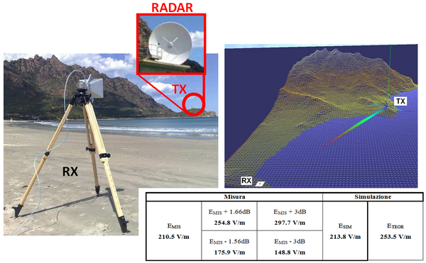 L'MRL dispone delle competenze e degli strumenti hardware e software per misurare e valutare per via teorica le emissioni EM prodotte da sorgenti radar. La figura mostra lo scenario dove è stata effettuata la misura a banda stretta, la sua modellizzazione software e il confronto fra i valori di campo elettrico misurato e simulato relativi ad un radar pulsato operante attorno a 5GHz.