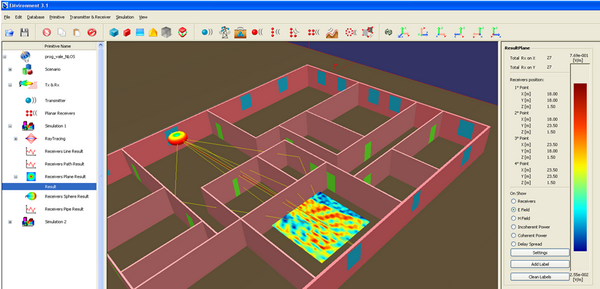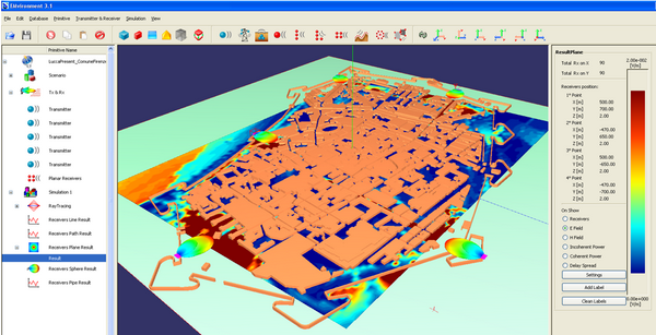 EMv è un software che consente l’analisi della propagazione del segnale elettromagnetico in ambienti complessi, sia outdoor che indoor, mediante tecniche di ray-tracing ad alta frequenza.