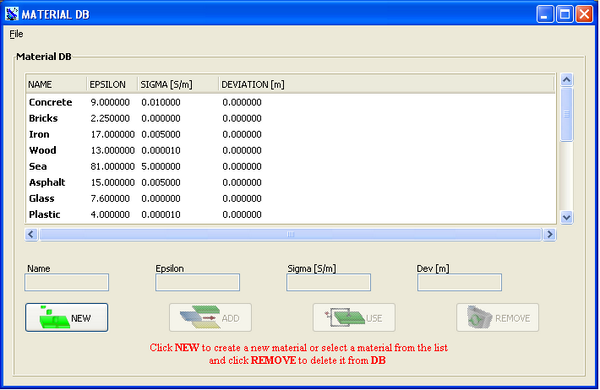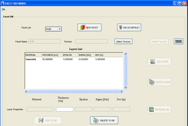 Il database dei materiali di EMv contiene i parametri elettrici dei materiali da associare alle piastre (facet) delle primitive geometriche che costituiscono lo scenario. I materiali sono caratterizzabili mediante: