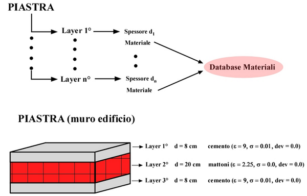 Si nota quindi il legame esistente tra il database delle piastre e quello dei materiali, dato che ogni layer è costituito da un materiale che è presente nel database dei materiali. Attraverso l'uso congiunto dei due database l'utente può definire facets multistrato da associare alle primitive geometriche nello scenario.