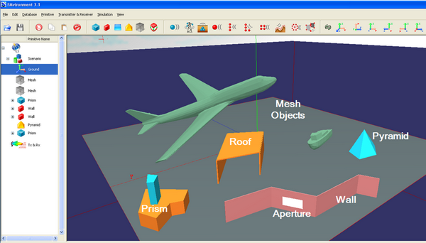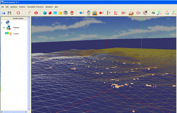 La primitiva Ground (terreno) può essere di due tipi: nel primo tipo, Ground Flat, il terreno è rappresentato da una singola facet quadrata caratterizzata dalla sua dimensione e materiale; nel secondo tipo, Ground DEM (Digital Elevation Model), il terreno è scomposto in un certo numero di facet triangolari secondo le specifiche del formato DEM in modo da riprodurre l’orografia del territorio da analizzare.