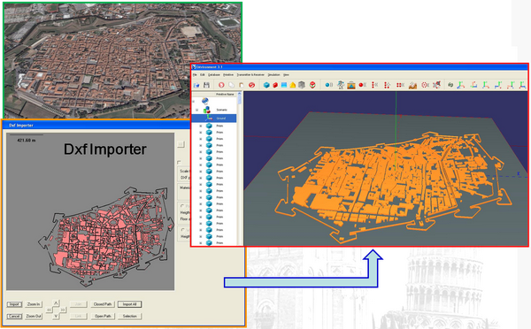 EMv permette la georeferenziazione di file "*dxf" e di tutte le altre primitive geometriche sui file DEM in modo da posizionare gli edifici sul terreno orografico e riprodurre fedelmente lo scenario da analizzare.