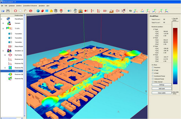 La valutazione dei livelli di campo elettrico è stata effettuata utilizzando il software EMvironment, sviluppato presso l'MRL, che permette l'analisi della propagazione del segnale elettromagnetico in ambienti complessi mediante tecniche di RayTracing ad alta frequenza derivanti dall'Ottica Geometrica (GO) e dalla Teoria Uniforme della Diffrazione (UTD).
